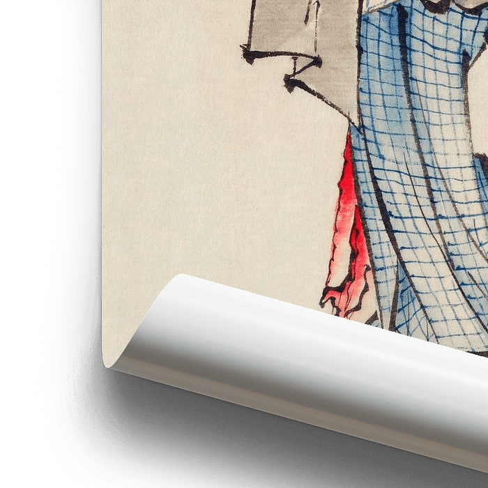 Woman, Full-Length Portrait, Standing, Facing Left, Holding Fan in Right Hand, Wearing Kimono with Check Design by Katsushika Hokusai (1760-1849), a traditional Japanese Ukyio-e style illustration of a Japanese woman in kimono