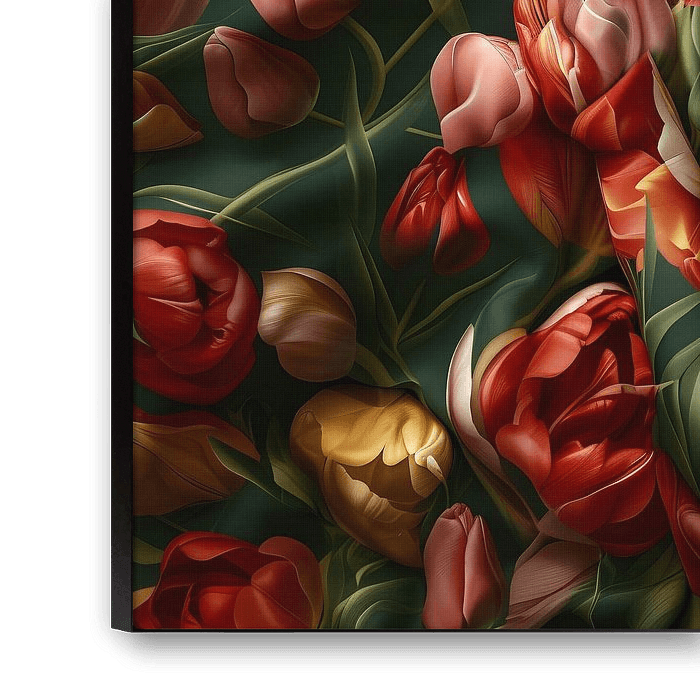 Fantasy illustration portrait of a woman camouflaged among colourful tulips.