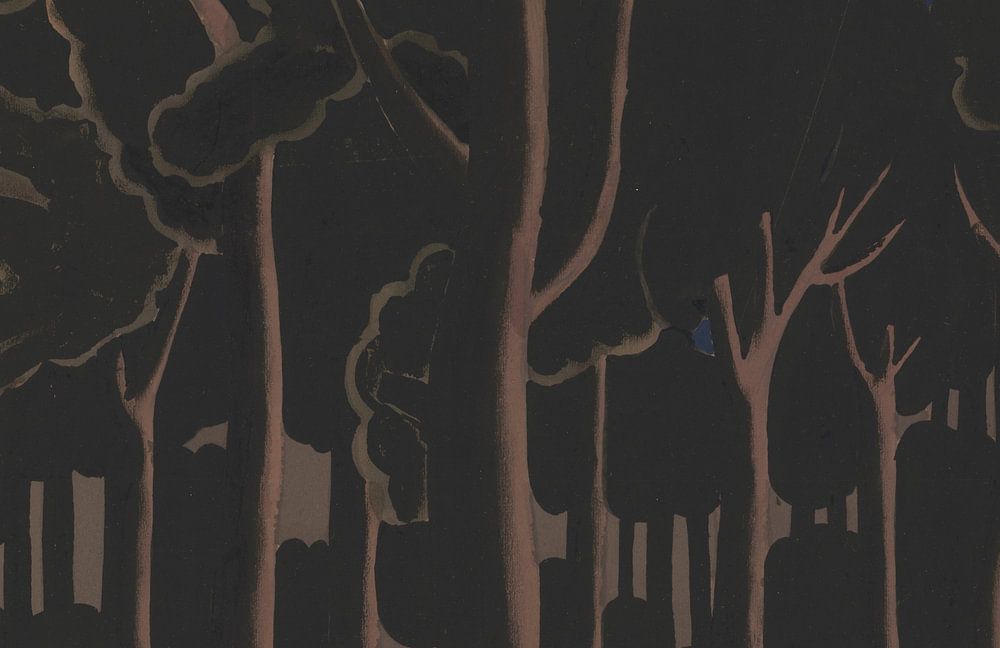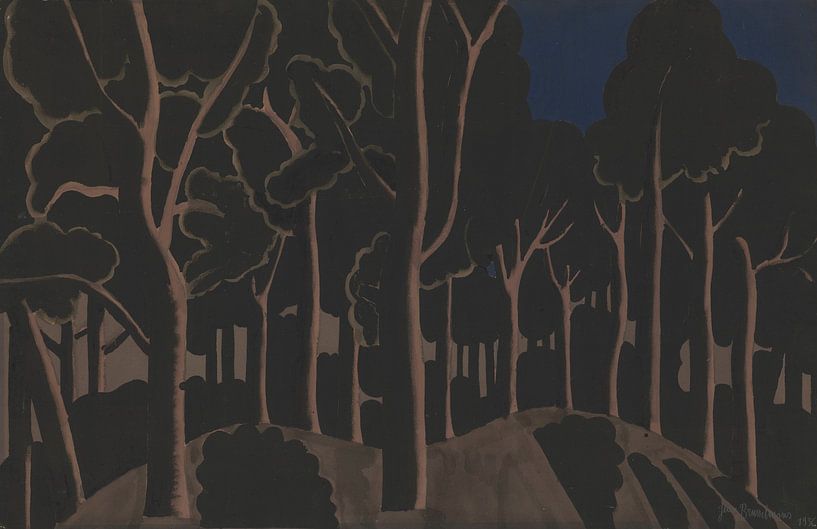 Over the course of his career, Jean Brusselmans developed a painting style in which nature is no longer a fleeting impression, but a solid, almost architectural presence. He reduced forms to their essence and gave landscapes a monumental tranquillity. In this painting, a group of trees is not a view through a forest, but a frontal rhythm of vertical trunks. They stand side by side like columns and together form an almost closed wall. The paint is dark and applied thickly; browns, greens and blacks dominate, giving the forest a dense, silent atmosphere. Light plays only a limited role and barely penetrates the canopy, reinforcing the feeling of seclusion. Typical of Brusselmans is that depth is less important than structure: the trees are patterns of paint, not botanical studies. Here, nature is not idyllic, but heavy and existential, like a tangible presence that fills the space.