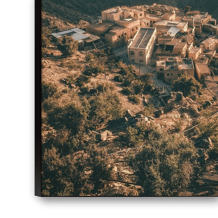 Buy this landscape artwork Jebel Akhdar in Oman with sunset village by Jean Claude Castor on canvas, ArtFrame, poster and wallpaper, printed on demand in high quality.