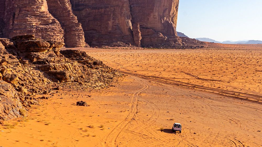 Small jeep in the orange landscape of Wadi Rum in Jordan.