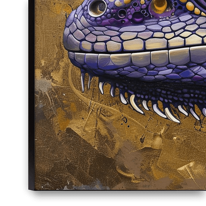 Jewel of the Jungle - This chameleon painting reveals a stunningly detailed and colourful rendering of a chameleon. The animal's skin is richly decorated with patterns of purple, blue, and gold hues, with each scale carefully elaborated to achieve an almost three-dimensional effect. The chameleon's eyes are particularly striking: the…
