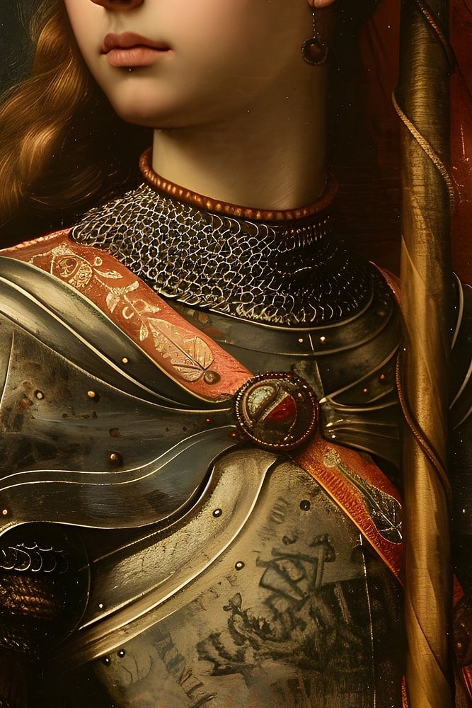 The painting shows Jeanne d'Arc in a realistic and detailed portrait that expresses her bravery and spiritual strength. Jeanne d'Arc is depicted with fine details and expressive facial features that emphasise her determination and strength of conviction. In the background are sumptuous colours and a meticulous rendering of textures that create a vibrant and authentic atmosphere. The style of the painting is reminiscent of the precise technique and detailed realism of Jan van Eyck, an important Dutch Renaissance painter known for his masterful portraits and religious works.