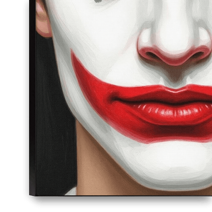 A striking, painted portrait depicts the Joker with a tearful expression.