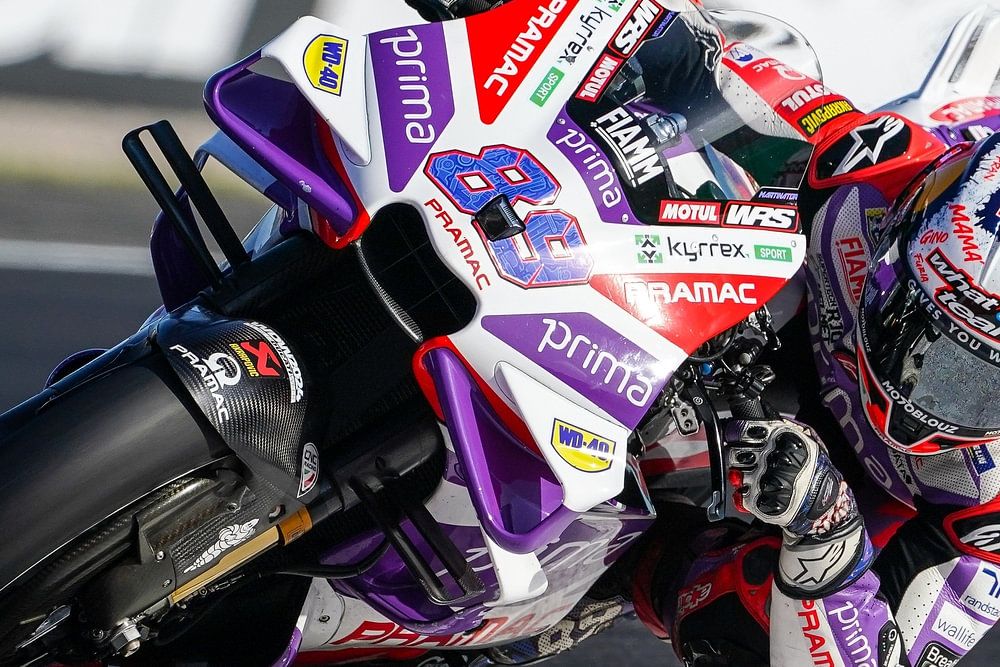 Jorge Martin on the Pramac Ducati during the final MotoGP race of 2023 at the Ricardo Tormo circuit in Valencia