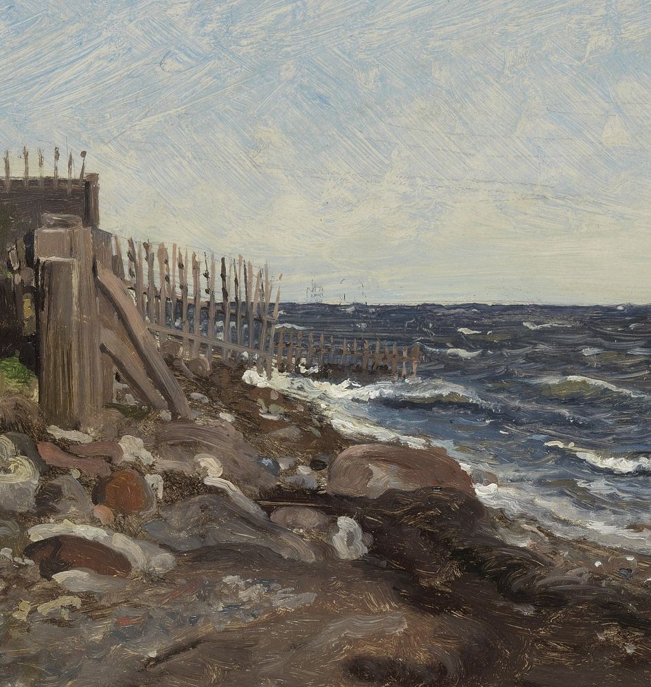 Coastline with a house, piece of beach and waves on the sea.