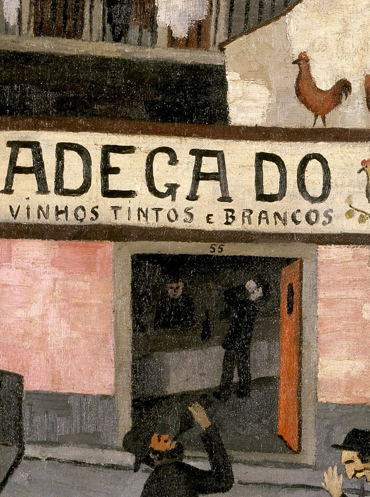 City view showing a wine cellar, the shop bears the name of the rooster also pictured. In the foreground two customers consuming the drink, one of whom is so drunk that he vomits, vomits, vomits in the street.