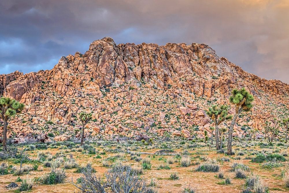 Dramatic clouds over a rocky mountain during a sunset at Joshua Tree National Park. Joshua Tree, California, USA. Thank you for your interest in my work.
