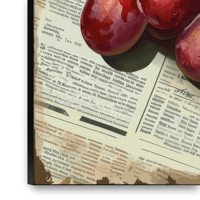 The picture shows a magnificent bunch of red grapes, juicy and shiny, draped on an old newspaper sheet. The deep purple and ruby colours of the grapes stand out vividly and give the motif a fresh, inviting character. The combination of natural shapes and the rustic background creates a harmonious still life.