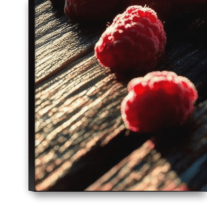 Juicy raspberries lie artfully on a weathered wooden surface that plays with gentle rays of light. Their bright, red colour contrasts with the natural, earthy tones of the wood and awakens the desire for fresh delights. This picture is a delicious addition to the kitchen and adds a fruity freshness to any room.