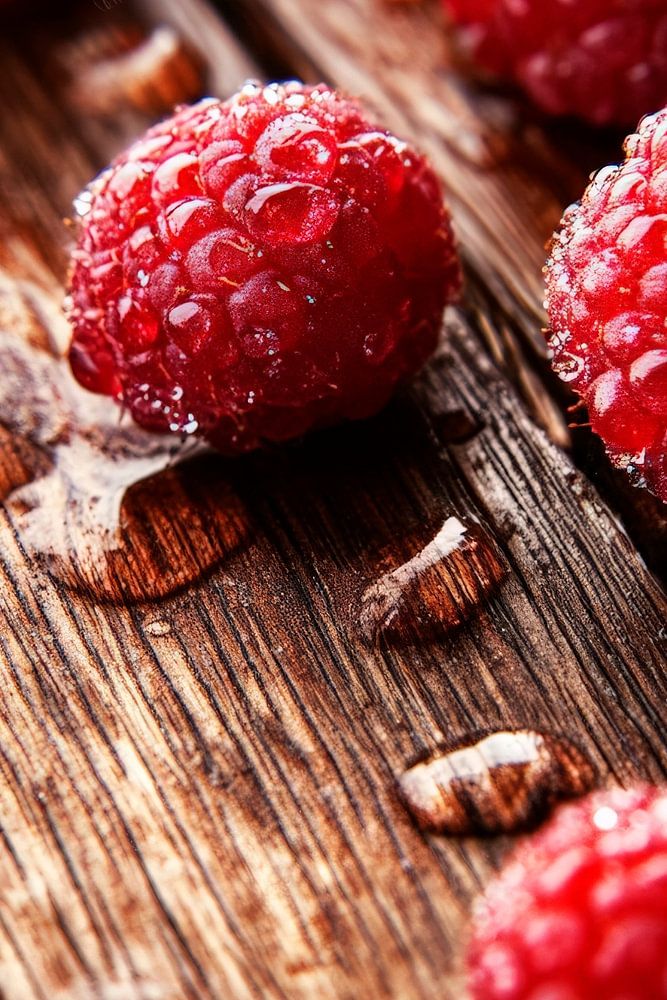 Juicy, ruby-red raspberries lie seductively on a rustic wooden background, the play of light and water droplets adding a fresh, lively note. This fruity arrangement is perfect for the kitchen, where it stimulates the appetite and enriches the atmosphere with a natural, inviting flair. A delight for the senses!