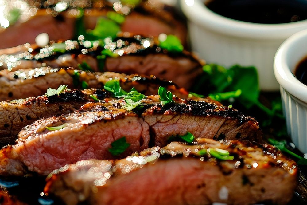 A juicy steak, perfectly served on a rustic wooden board, exudes aromatic delicacies. Framed by delicate herbs and tempting dips, it invites you to savour and feast. This picture brings joie de vivre and gastronomic flair to any kitchen, ideal for cookery lovers and gourmets.