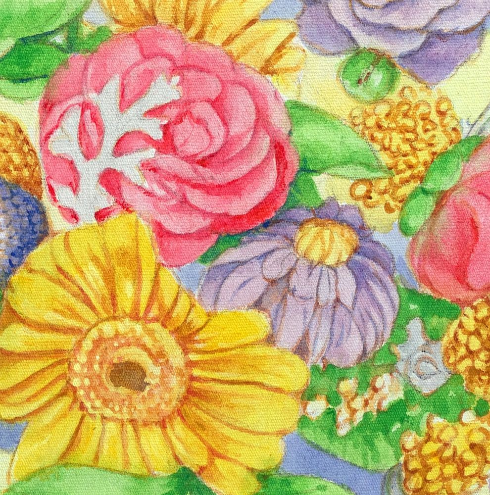 July Flowers. The colors of hot summer in Chicago. Yellow the sun and blue so welcomed as the rain. The artist uses color forms almost like an abstract. The normally used visual support in the form of a pot is no longer necessary to enjoy the color fantasy delivered by flowers.