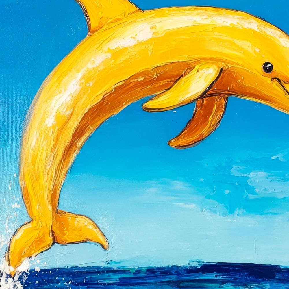 A bright yellow dolphin rises up in a radiant blue sky, expressing all its jubilation with splashing water. The harmonious combination of sea and sky reflects the joy of life, while the soft brushstrokes capture the dynamism of the leap. A scenario full of energy and joy that invites you to dream.