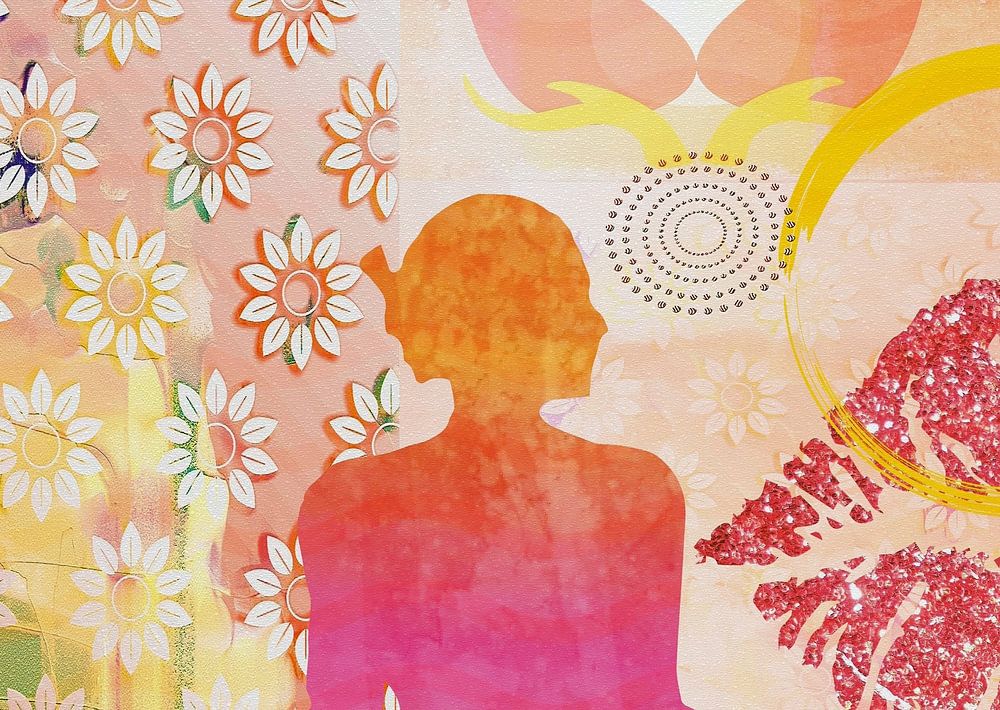 Abstract spiritual colorful mixed media image with text and patterns in collage style