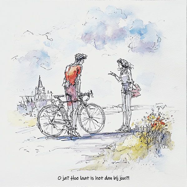 A cyclist has briefly dismounted, but there’s no escaping the conversation now. At the edge of the route, his wife confronts him about the fact that he’s late again. With loose pen strokes and light watercolour, this piece captures precisely that familiar moment when sporting freedom and family time clash. The one-liner “Oh really?…