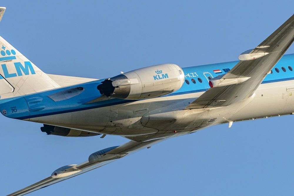 KLM Cityhopper's Fokker 70 takes off from the Aalsmeer Runway at Schiphol Airport.