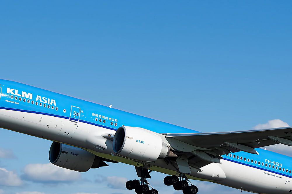 The KLM PH PQH Boeing 777-206ER, Hadrian's Wall, departs from Amsterdam International Airport Schiphol.