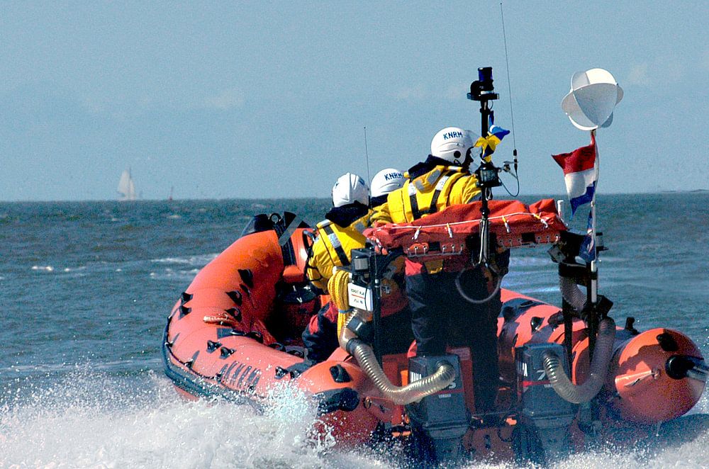KNRM with their rescue boats sailing at full speed on the Wadden Sea near Ameland.