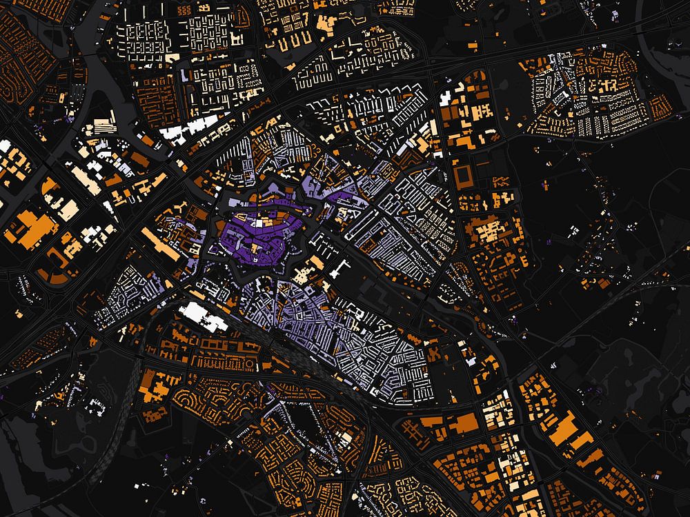 De gekleurde vlakken op de kaart zijn alle gebouwen van de stad Zwolle. Elk decennium van de vorige eeuw heeft een aparte kleur. Blauw is het oudste, van voor 1900, en bruin/Oranje vlakken zijn het meest recent gebouwd. In de binnenstad zijn alle gebouwen die tegen elkaar staan gekleurd naar het oudste gebouw in de rij. Hierdoor is de oude binnenstad beter zichtbaar.