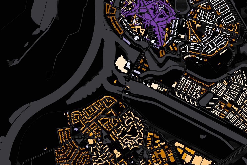 De gekleurde vlakken op de kaart zijn alle gebouwen van de stad Doesburg. Elk decennium van de vorige eeuw heeft een aparte kleur. Blauw is het oudste, van voor 1900, en bruin/Oranje vlakken zijn het meest recent gebouwd. In de binnenstad zijn alle gebouwen die tegen elkaar staan gekleurd naar het oudste gebouw in de rij. Hierdoor is de oude binnenstad beter zichtbaar.
