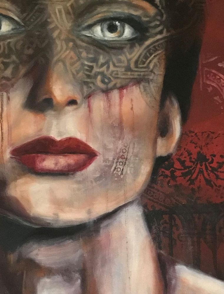 Kala' is the master of time but also of black magic. The mask she wears frames her eyes, emphasises her direct gaze, but hides nothing. It seems more like a tattoo than a mask. Kala's gaze is that of a ruler, confident and inviting, but at the same time wise, mysterious and timeless. She seems to be waiting to see if anyone will dare to approach her in order to make acquaintance with her magic. The pictorial technique as well as the colouring ruby red and black underline the mystical effect of Kala, who seems to be sitting in a fabric-covered room. Her mask-like tattoo as well as parts of her face pick up the pattern of the fabric, the figure seems to be connected to the background and thus gets a dramatic depth effect.