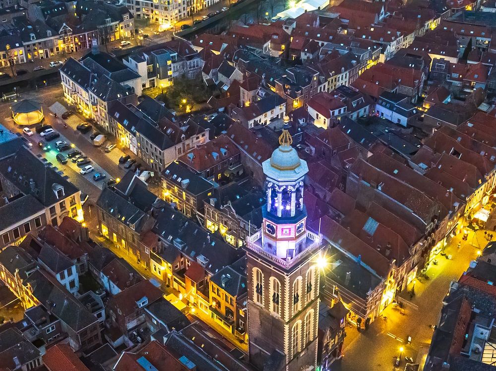Kampen Nieuwe Toren (New Tower) during a winter evening just after sunset over the hanseatic league city on the riverbanks of the river IJssel. The Nieuwe Toren is located in the heart of Kampen's historic city center. The tower is a prominent landmark and a symbol of the city's rich history.