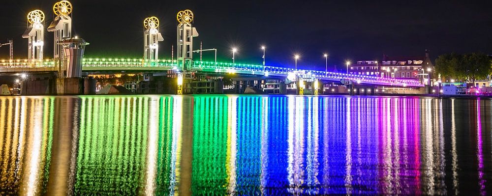City Bridge over the river IJssel in Kampen, Overijssel, illuminated in rainbow colors for National Coming Out Day, an annual LGBT awareness day. National Coming Out Day (NCOD) is celebrated to support gay, lesbian, transgender and bisexual people in "coming out of the closet".