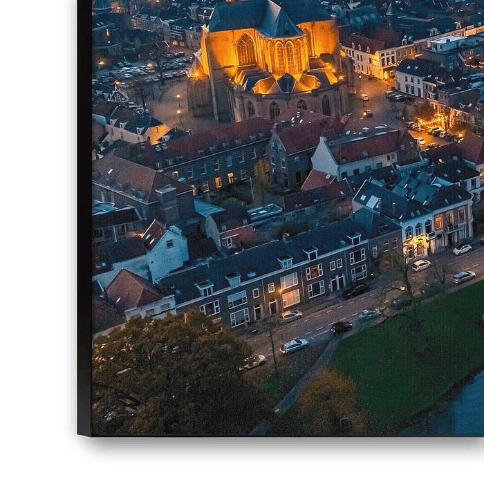 Kampen on the banks of the river IJssel during sunset seen from above with the Koornmarktspoort and Bovenkerk in the old town of Kampen during an autumn sunset. The koornmarktspoort is the oldest gate of Kampen located at the riverbank of the IJssel. The Bovenkerk or the Church of St. Nicholas is a large, Gothic church and the most striking element on the skyline of Kampen at the river IJssel in the Overijssel province.