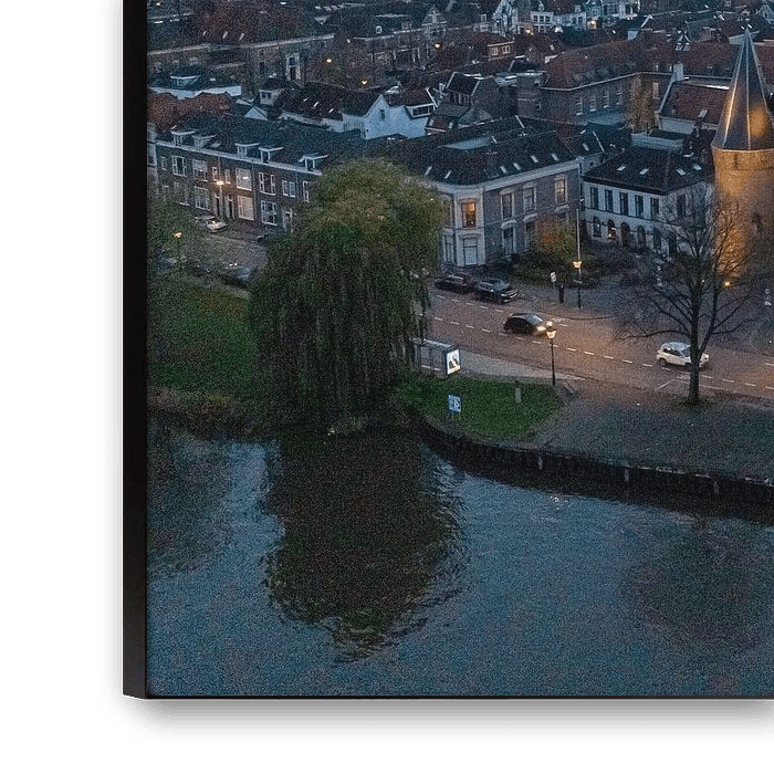 Kampen on the banks of the river IJssel during sunset seen from above with the Koornmarktspoort and Bovenkerk in the old town of Kampen during an autumn sunset. The koornmarktspoort is the oldest gate of Kampen located at the riverbank of the IJssel. The Bovenkerk or the Church of St. Nicholas is a large, Gothic church and the most striking element on the skyline of Kampen at the river IJssel in the Overijssel province.