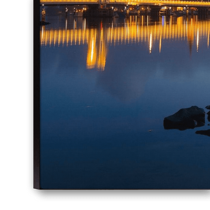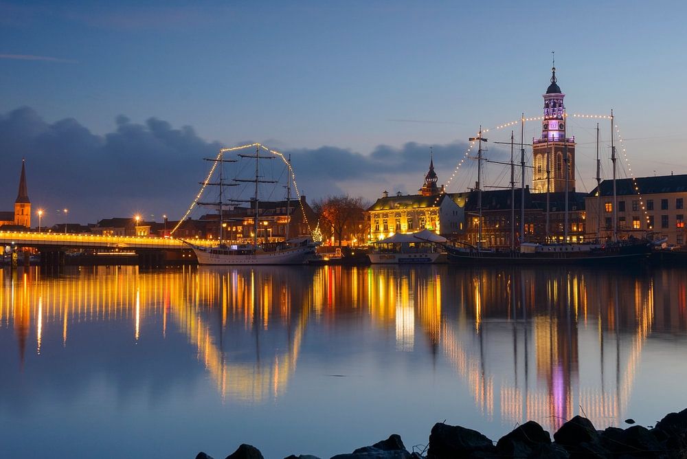 Evening on the skyline of the city of Kampen in Overijssel, The Netherlands. The lights of the city are reflected in the calm water while the sky has turned blue right after sunset.