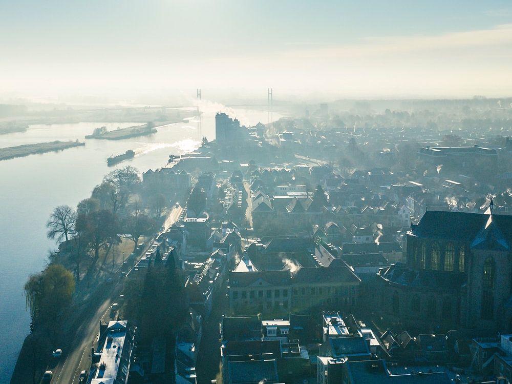 Kampen city view at the river IJssel during a cold winter sunrise at the start of a cold bright winter day with light snow on the roofs. Kampen is an ancient Hanseatic League city at the shore of the river IJssel in Overijssel, The Netherlands.