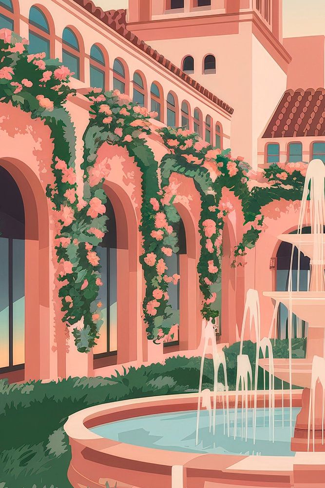 A picturesque hideaway that enchants with vibrant plants and a gentle fountain. The warm colours and charming architectural detail invite you to dream and create a calming atmosphere. Perfect for the living room to create a relaxing oasis of inspiration. Every hour here is a pleasure!