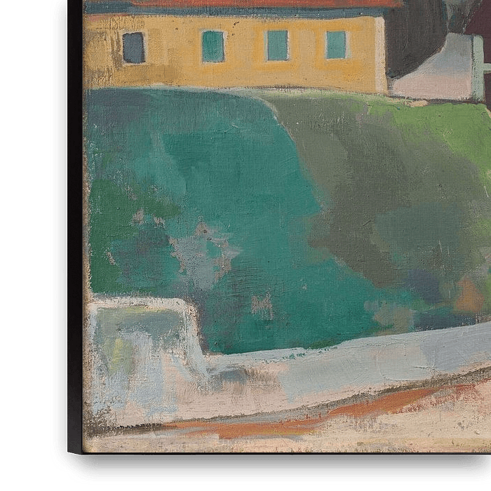 Een gebogen weg leidt de blik het beeld in, geflankeerd door lage muurtjes en een gele gebouw met…