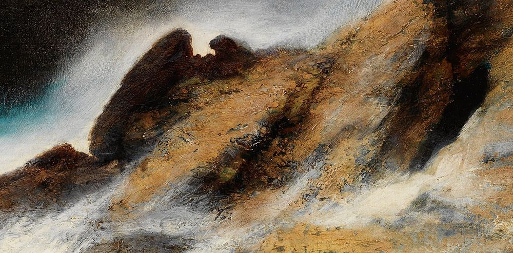 The sea pounds on the shore with its waves in this ominous picture of natural beauty. The wind takes the water of azure up the rocks.