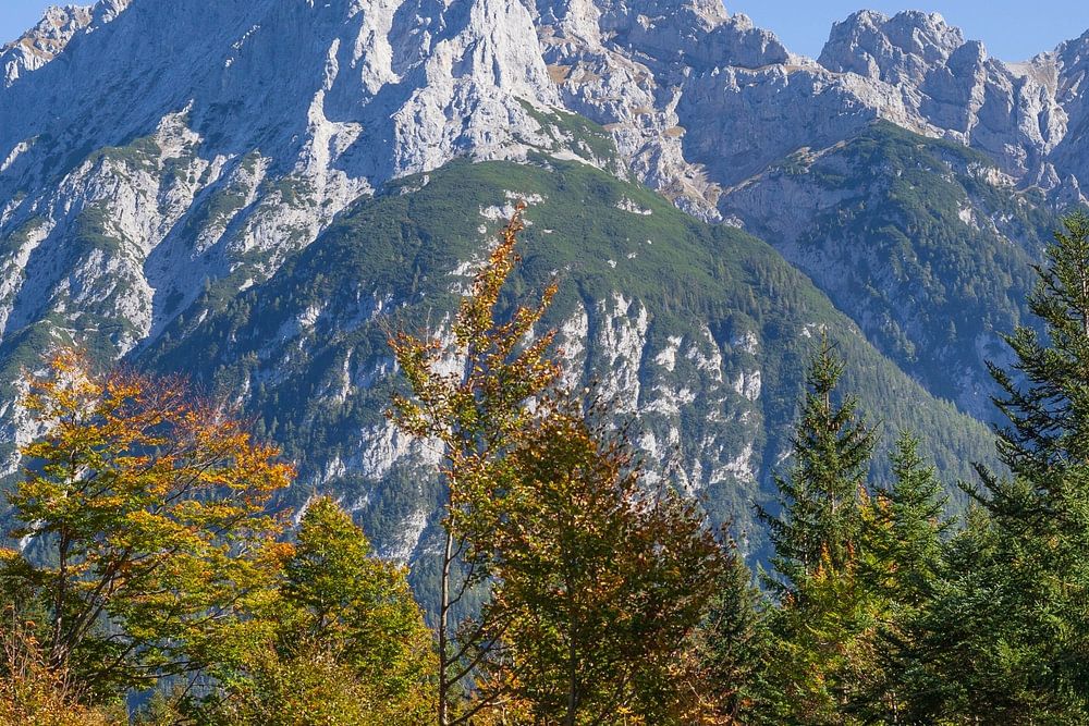 Karwendel Mountains in autumn, Mittenwald, Werdenfelser Land, Upper Bavaria, Bavaria, Germany