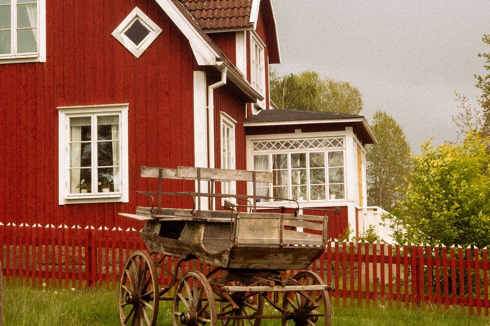 This picture shows a pretty, traditional Swedish house. This house is special because it is the film location of the Michel films from the 70s. The traditional, pretty red colour is very visible and the sky gives a good contrast. The old-fashioned horse-drawn carriage makes for an interesting composition as it draws the viewer's eye towards the house. The "toalett" sign adds humour to the image, which fits in well with the original films. In addition, grain was added later in the post-processing of the image to make the house look more nostalgic and more recognisable from the films.