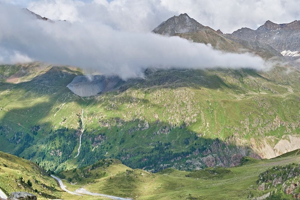 Where it was raining in the valley it cleared up in the top. The blue sky became visible. This made the view of the Kaunertal even more beautiful. Watch the road go by. The sun falls on the tail of the glacier where you can see the transition to the meltwater. There is a waterfall. The clouds. So beautiful.