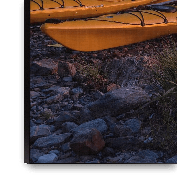 Two kayaks on the shores of Lake Ottsjö during a calm and colourful sunset in Yämtland, Sweden. This secluded lake in the Jämtlandsfjällen is perfect for a wonderful kayaking adventure.