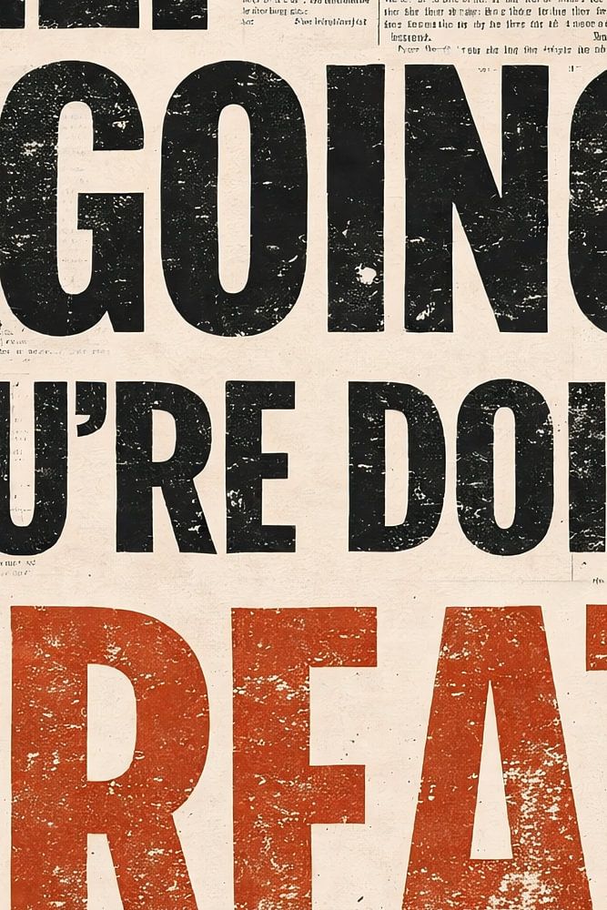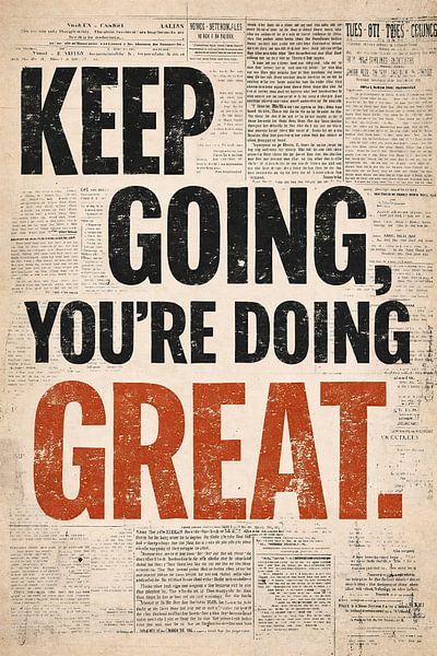 An uplifting typography artwork featuring the motivational quote “Keep Going, You’re Doing Great” set against a vintage newspaper background. With bold lettering and a distressed texture, this piece delivers encouragement and confidence while enhancing modern and industrial interiors.