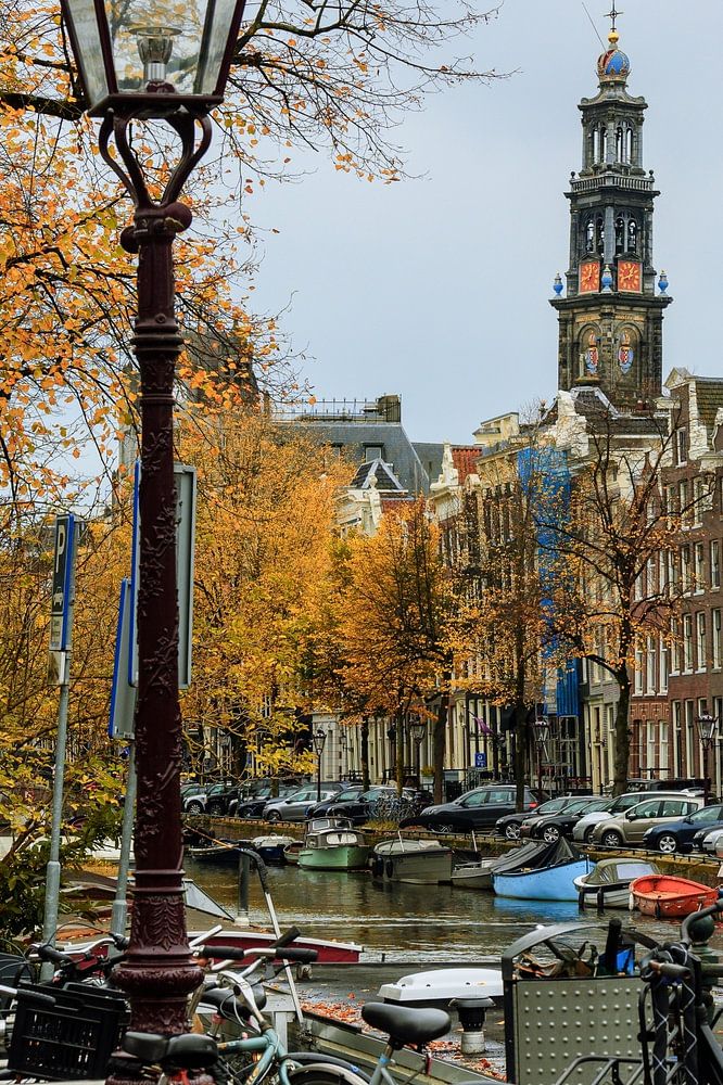 The Keizersgracht, trees in beautiful autumn colours, a lamppost in the foreground and bicycles against the bridge railing. And to top it all off, the Westerkerk tower in the background. It doesn't get any more Amsterdam!