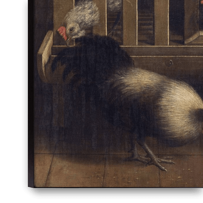 Painting from the 17th century showing two males, literally and figuratively two roosters who are at each other's throats. Behind them other hens, hens in a crate. On the crate a still life of two rabbits and three apples. A snapshot of farm life and farm animals.