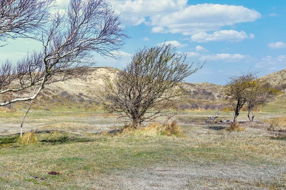 A nature image of the dune landscape National Park South Kennemerland. Which is located in the province of North Holland. A beautiful wide nature image of this landscape in the dunes. In the foreground a beautiful birch.