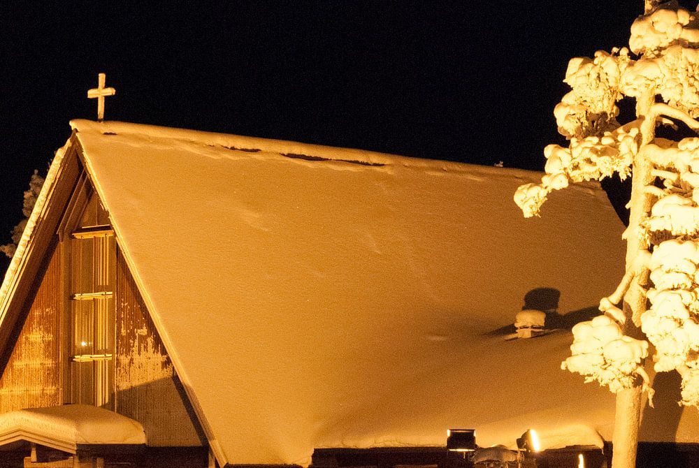 Dit kerkje is te vinden in Saariselkä in Finland. 's Avonds als het donker is, is het kerkje schitterend verlicht. Door de laag sneeuw op de kerk en de bomen er omheen, krijgt het een sprookjesachtig uiterlijk.