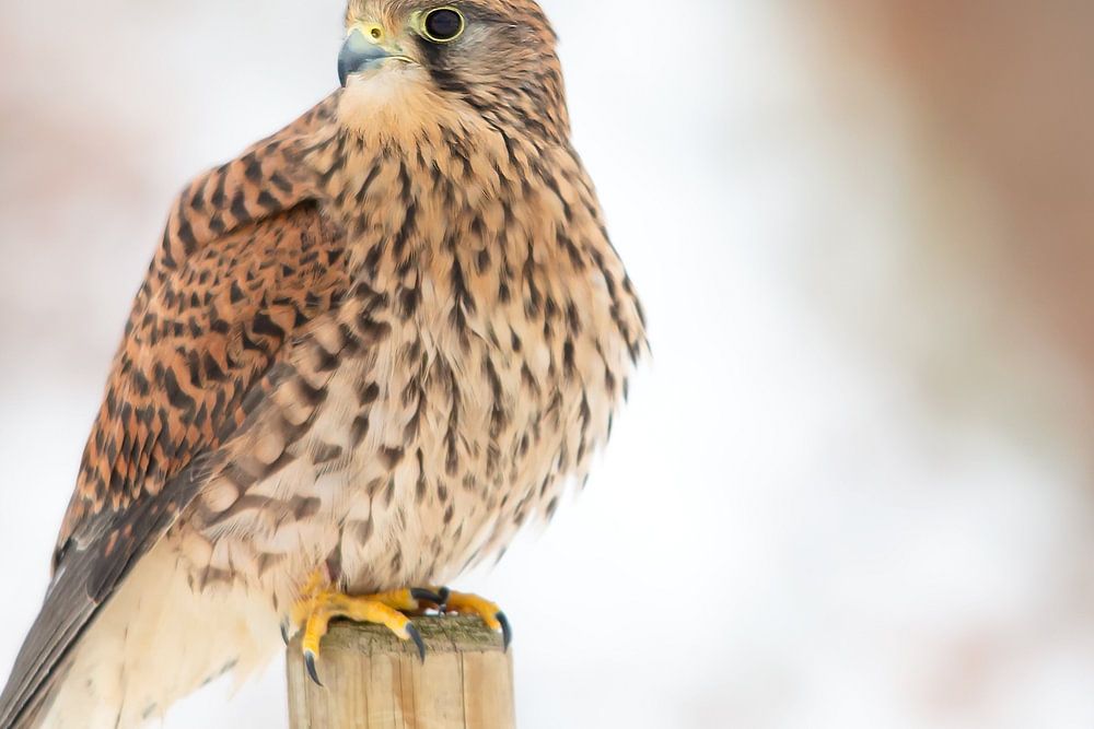 Buy this bird art Kestrel in winter landscape by Aukje Ploeg on canvas, ArtFrame, poster and wallpaper, printed on demand in high quality.