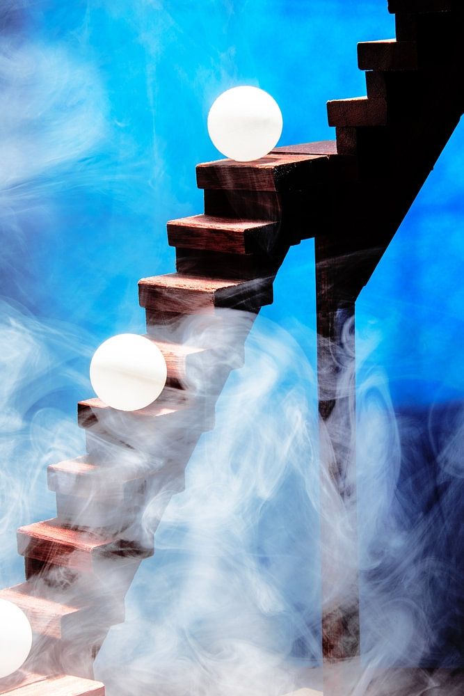 Wooden staircase with 5 white ping pong balls on top, surrounded by a transparent curtain of white smoke with an oriental window in the background. All this on a red high-gloss background.