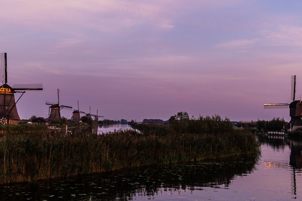 Windmills on the Kinderdijk photographed at the setting sun with evening colours in the sky.