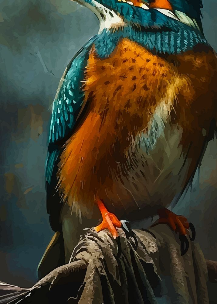 This striking chiaroscuro oil pastel painting of a kingfisher reveals the bird in dramatic contrast, its vivid plumage glowing against a shadowed backdrop. Deep blacks and moody greys carve out the surrounding space, allowing the electric blues and fiery oranges of the bird to emerge with luminous intensity. Each stroke emphasizes the sleek contour of its feathers, highlighting both its elegance and predatory focus. The interplay of light and dark creates a timeless, almost cinematic atmosphere, as if the kingfisher has just been caught in a fleeting beam of sunlight above dark waters. Rich in texture and depth, the painting invites viewers into a moment of stillness and mystery, making it an evocative piece for collectors who appreciate bold artistry infused with natural beauty.