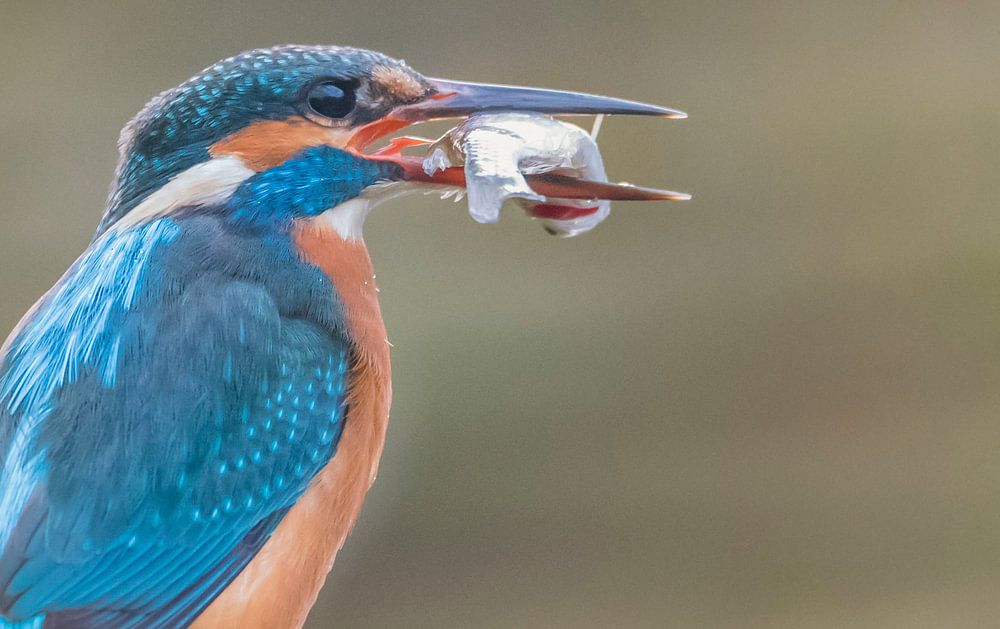 A beautiful female kingfisher, sitting on an autumn branch, has just caught a fish, in South Holland in the Netherlands.
