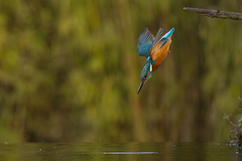 The kingfisher the most beautiful bird in the Netherlands in full flight on its way to catch the fish underwater. It catches the fish with its bill, which is very special because it knows the refraction of the water and never misses it. The bright blue and orange colour is characteristic of this beautiful bird.